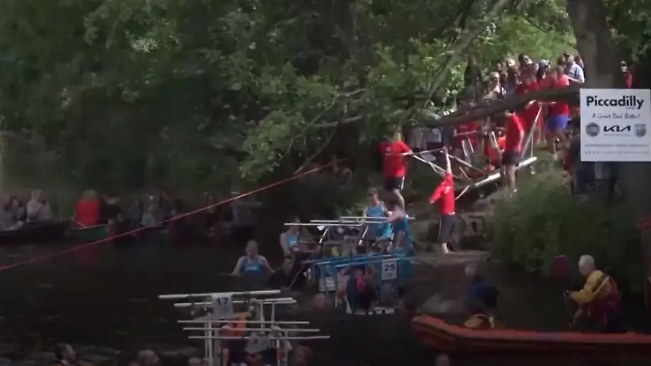 Nur einer darf ausruhenBriten ziehen beim "Bed Race" Matratzen durch Fluss