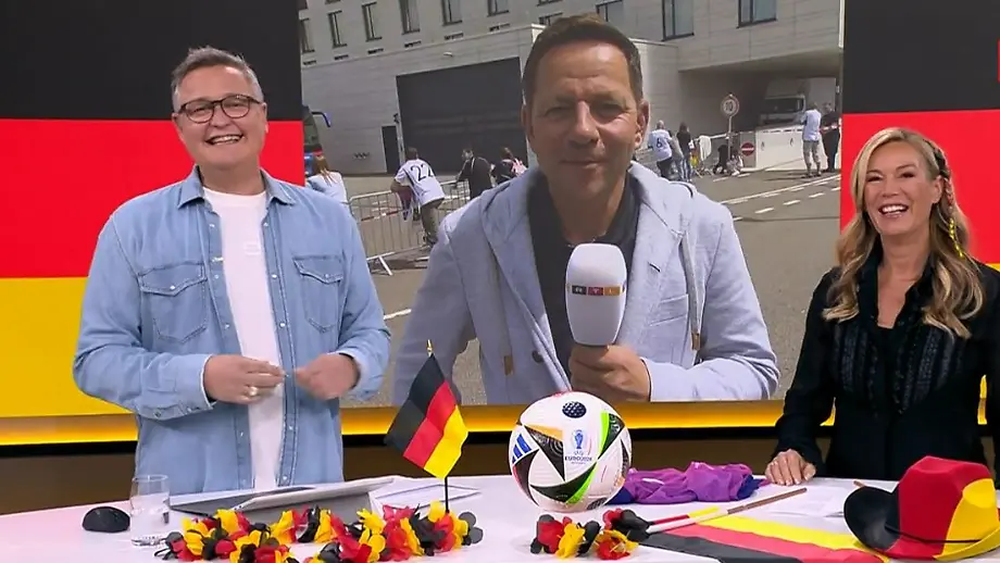 05.07.2024, 17:23 UhrTimo Latsch berichtet für RTL und ntv aus der Welt des Sportes. Dabei entlockt Moderatorin Katja Burkhard ihm eine Wettzusage: Sollte die deutsche Nationalmannschaft ins Halbfinale einziehen, wolle er einen farblichen Wechsel auf seinem Kopf vollziehen.