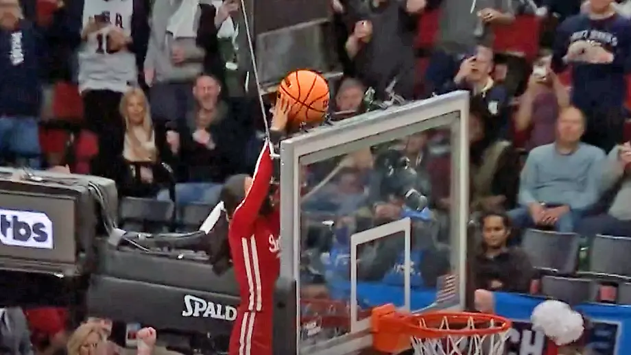 18.03.2022, 20:26 UhrDas Basketballspiel zwischen den US-Teams Indiana und St. Marys verzögert sich, denn: Der Ball steckt in einem der Körbe fest. Besenstiel und Stuhl helfen leider nicht. Als der Ball schlussendlich wieder den Boden berührt, feiert nicht nur das Stadion, sondern das ganze Internet.