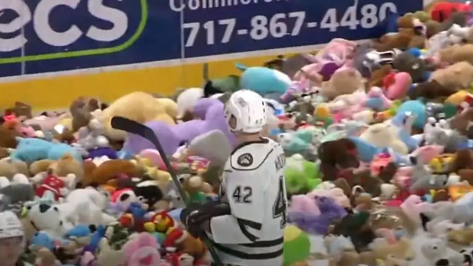 24.01.2022, 11:05 UhrGekuschelt wird auf dem Eishockey-Feld selten, im Gegenteil. Umso skurriler sind die Szenen, die sich jährlich beim AHL-Klub der Hershey Bears abspielen. Beim "Bear Toss" verwandelt sich das Spielfeld in wenigen Momenten in ein buntes Plüsch-Panorama. Dabei geht es auch um einen guten Zweck.