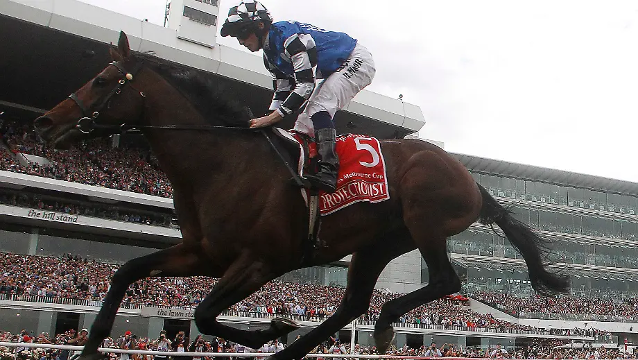 04.11.2014, 18:54 UhrDer Melburne Cup in Australien ist ein gesellschaftliches Großereignis. Dieses Mal starten 22 Galopper, der Favorit ist schon schnell weit abgeschlagen. Auf der Zielgeraden gibt "Protectionist" Gas und überquert mit seinem Jockey Ryan Moore die Zielgerade mit großem Vorsprung. Doch neben dem Jubel wird das Rennen auch von traurige Folgen überschattet.