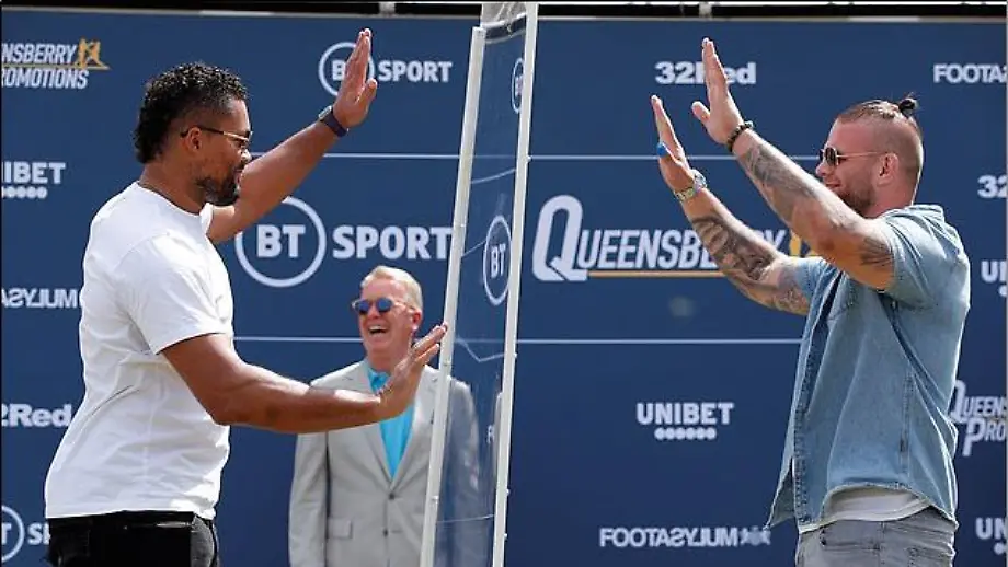 22.07.2020, 18:31 UhrUnter strengen Hygieneregeln treffen Schwergewichtsboxer Joe Joyce und Michael Wallisch zu ihrem ersten Face-Off vor dem Kampf in London aufeinander. Die ungewohnte Situation nehmen die beiden Profis mit Humor.