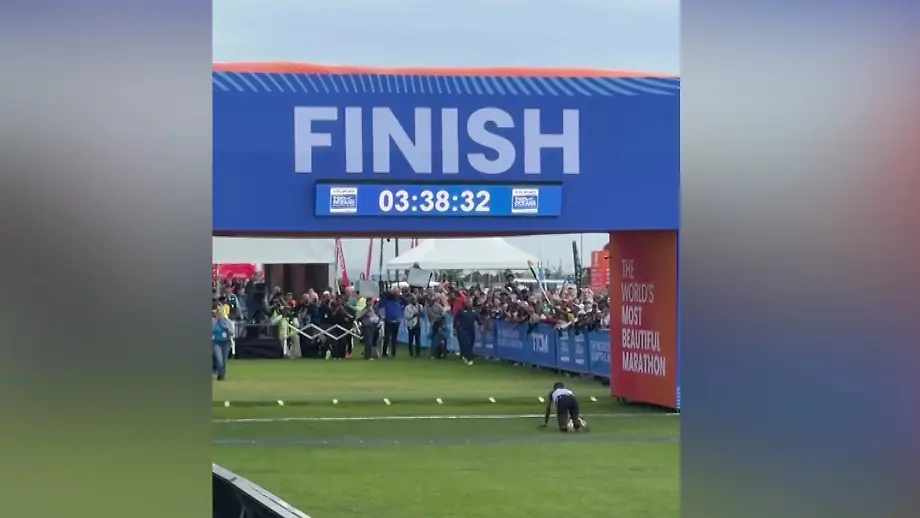 13.04.2026, 16:54 UhrBeim Two Oceans Marathon in Südafrika bricht eine äuferin nach 56 Kilometern kurz vor dem Ziel zusammen und krabbelte mehrere Meter ins Ziel. Nobuhle Nobukhosi Tshuma erkämpft damit die Bronzemedaille.