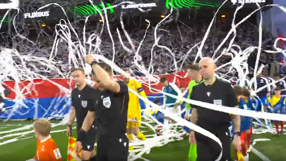 10.04.2026, 20:08 UhrBeim Spiel des ACF Fiorentina gegen Crystal Palace überlegen sich die Londoner Fans eine ganz besondere Protestform - die wohl größte Klopapier-Choreo aller Zeiten. Aberhunderte an Klopapierrollen regnet es in das Stadion, der ein oder andere Spieler und Trainer muss mit dem Papierschlangen kämpfen.