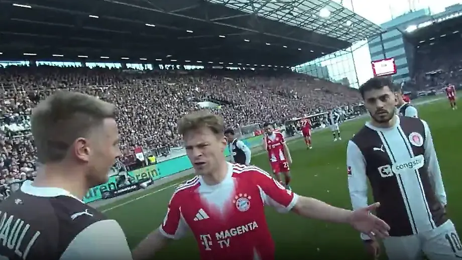 15.04.2026, 09:20 UhrBeim 5:0-Glanzsieg der Bayern gegen den FC St. Pauli kommt es zu einem intensiven Zweikampf zwischen Münchens Michael Olise und dem Hamburger Karol Mets. Joshua Kimmich schmeckt der harte Einsatz des Paulianers gar nicht. Er beschwert sich lautstark beim Schiri, dessen Refcam filmt mit.