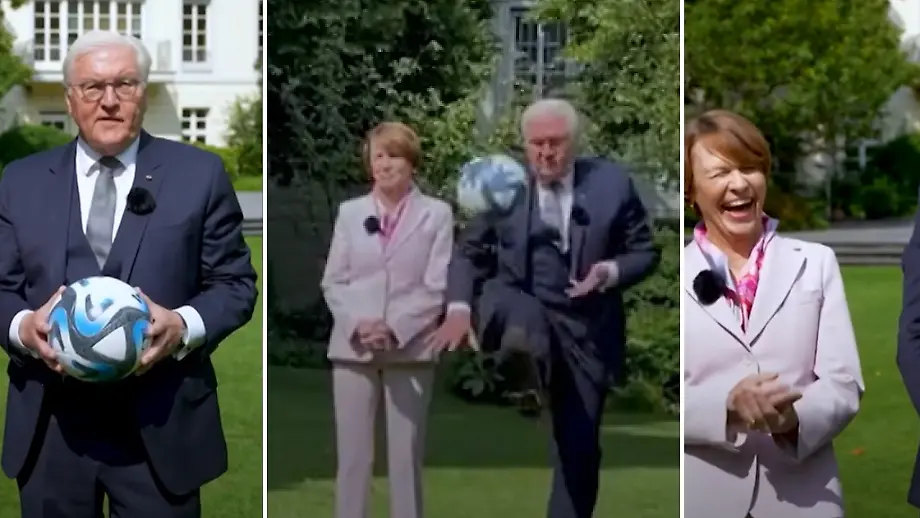 12.07.2023, 11:32 UhrDer Rasen im Garten von Schlosse Bellevue in Berlin muss sich vor wenigen Fußballplätzen verstecken. Der Hausherr und Bundespräsident Steinmeier schickt von dort einen Gruß zum Start der Frauen-WM in Australien. Im Teamplay mit seiner Frau wirken die Spielzüge etwas einstudiert - aber der Abschluss sitzt.
