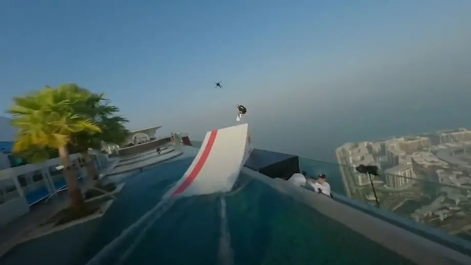 04.12.2023, 21:35 UhrMit diesem Stunt dürfte sich Wakeskate-Pioneer Brian Grubb einen Lebenstraum erfüllt haben. Auf einem Hochhaus in Dubai surft der 43-Jährige mithilfe einer Drohne 95 Meter durch einen Infinity-Pool, um sich am Ende 300 Meter in die Tiefe zu stürzen.