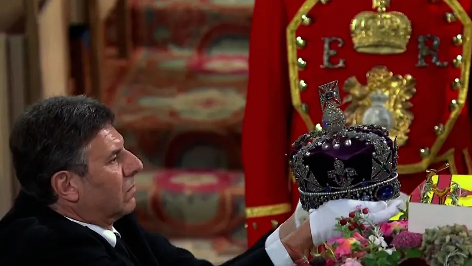 19.09.2022, 18:15 UhrKrone, Zepter und Reichsapfel: Beim Aussegnungsgottesdienst in der St.-Georges-Kapelle entfernt der britische Kronjuwelier die Kronjuwelen vom Sarg der Queen. Sie werden daraufhin vom Dekan auf dem Altar platziert, ehe die Nationalhymne den Gottesdienst beendet.