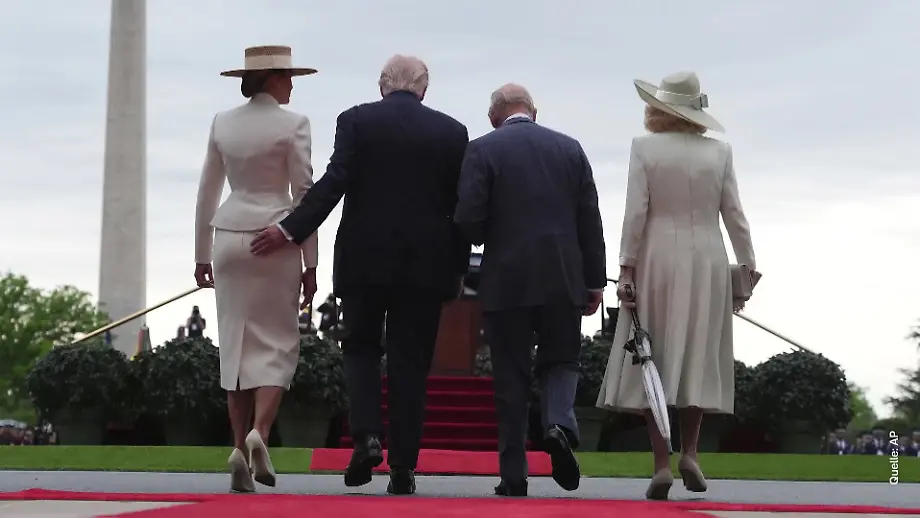 30.04.2026, 17:00 UhrBeim Empfang des britischen Königspaares sorgen Donald und Melania Trump mit ihrem Verhalten für Gesprächsstoff. Zuerst gibt der US-Präsident seiner Frau einen Klaps auf den Po, dann entzieht diese beim Staatsbankett demonstrativ die Hand.