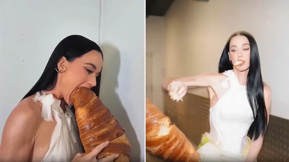 Popstar beißt beherzt zuGigantisches Croissant entreißt sich Katy Perrys Griff
