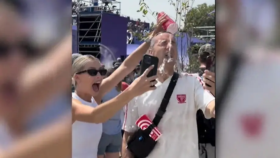 01.08.2024, 16:10 UhrLena Gercke fasst am Rande der Olympischen Spiele in Paris einen geheimen Plan. Das Model lässt Moderator Kai Pflaume glauben, sie wolle ein Selfie mit ihm machen. Vor laufender Kamera kippt sie ihm kurzerhand einen Becher Wasser über den Kopf. Ihre Fans feiern die Idee mit der "Pflaumendusche".