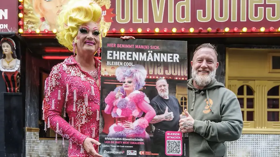 17.09.2025, 15:34 UhrMit provokanten Plakaten will sich die Kampagne "Gewalt ist scheiße - feier friedlich!" bundesweit gegen Gewalt im Nachtleben richten und für Aufklärung sorgen. Die Plakatkampagne aus St. Pauli startet bundesweit. Ganz vorne mit dabei ist die Hamburger Kiezgröße Olivia Jones.