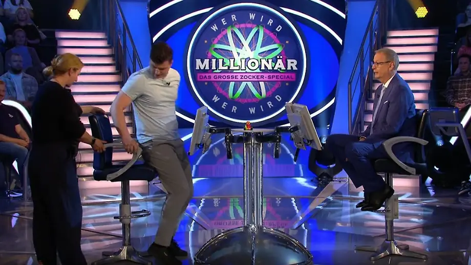 03.06.2025, 10:56 UhrGünther Jauch will im "Großen Zocker-Spezial" gerade mit der Frage an den Kandidaten loslegen, als sich plötzlich die Studioregie über die Lautsprecher meldet. Der Kandidat hat seinen Stuhl so weit verrückt, dass ein Regelverstoß droht.