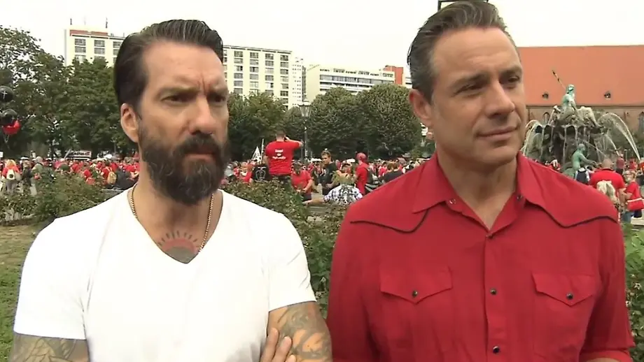 09.09.2020, 13:48 UhrKeine Einnahmen durch Corona: Unter dem Motto "Alarmstufe Rot" demonstrieren Tausende Mitarbeiter der Event-Branche in Berlin für mehr finanzielle Hilfen. Mit dabei: Alec Völkel und Sascha Vollmer von der Band Bosshoss. Warum sie die Aktion unterstützen, erklären sie im Interview mit ntv.