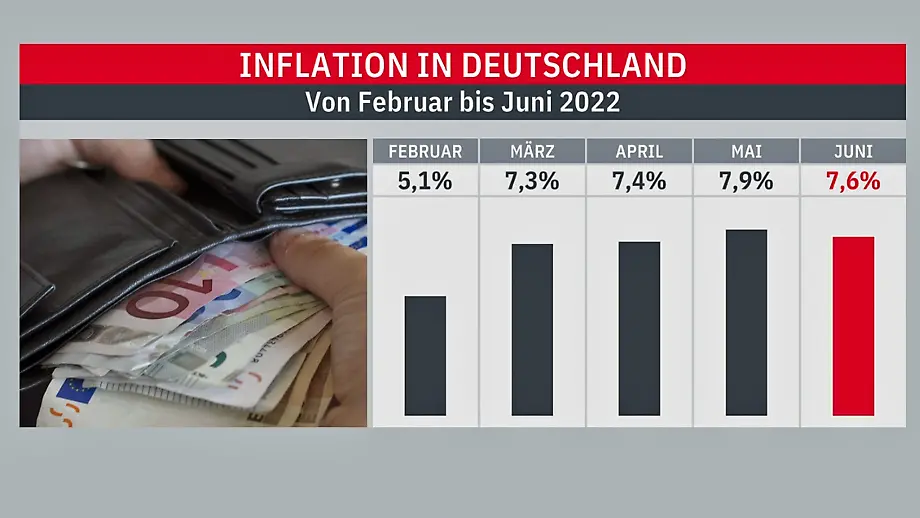 13.07.2022, 15:18 UhrNach steilem Anstieg in den Vormonaten geht die Inflationsrate im Juni mit 7,6 Prozent leicht zurück. Laut Experten zeichnet sich aber noch keine Kehrwende ab. Der Chefsvolkswirt der ING Deutschland Carsten Brzeski rechnet sogar mit zweistelligen Inflationswerten.