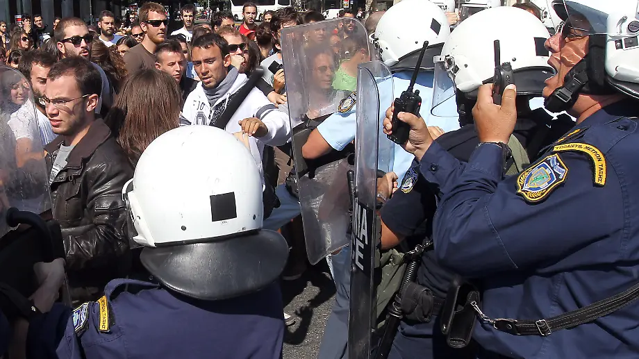 05.10.2011, 14:53 UhrDie Proteste in Athen gegen die Massenentlassungen von Beamten eskalieren. Eine Gruppe von 300 Linksradikalen bewirft die Polizei mit Steinen. Die Sicherheitskräfte setzen Tränengas ein, um die Autonomen auseinander zu treiben.
