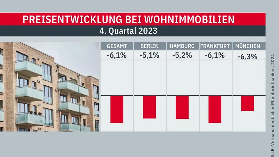 12.02.2024, 12:05 UhrDer Verband deutscher Pfandbriefbanken meldet einen weiteren Rückgang der Immobilienpreise. Besonders stark betroffen sind Gewerbeimmobilien, doch auch bei den Wohnimmobilien gibt es deutliche Abfälle. Ist jetzt der richtige Zeitpunkt für einen Immobilienkauf gekommen?