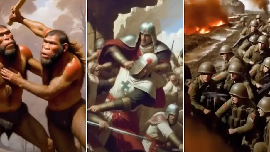 12.03.2023, 11:36 UhrSeit es Menschen gibt, gibt es gewaltsame Konflikte. Der Künstler Fabio Comparelli visualisiert mit einer Künstlichen Intelligenz in einer beeindruckenden Animation Jahrtausende kriegerischer Menschheitsgeschichte. In 60 Sekunden morpht sich die Komposition von der Steinzeit bis zur Atombombe.