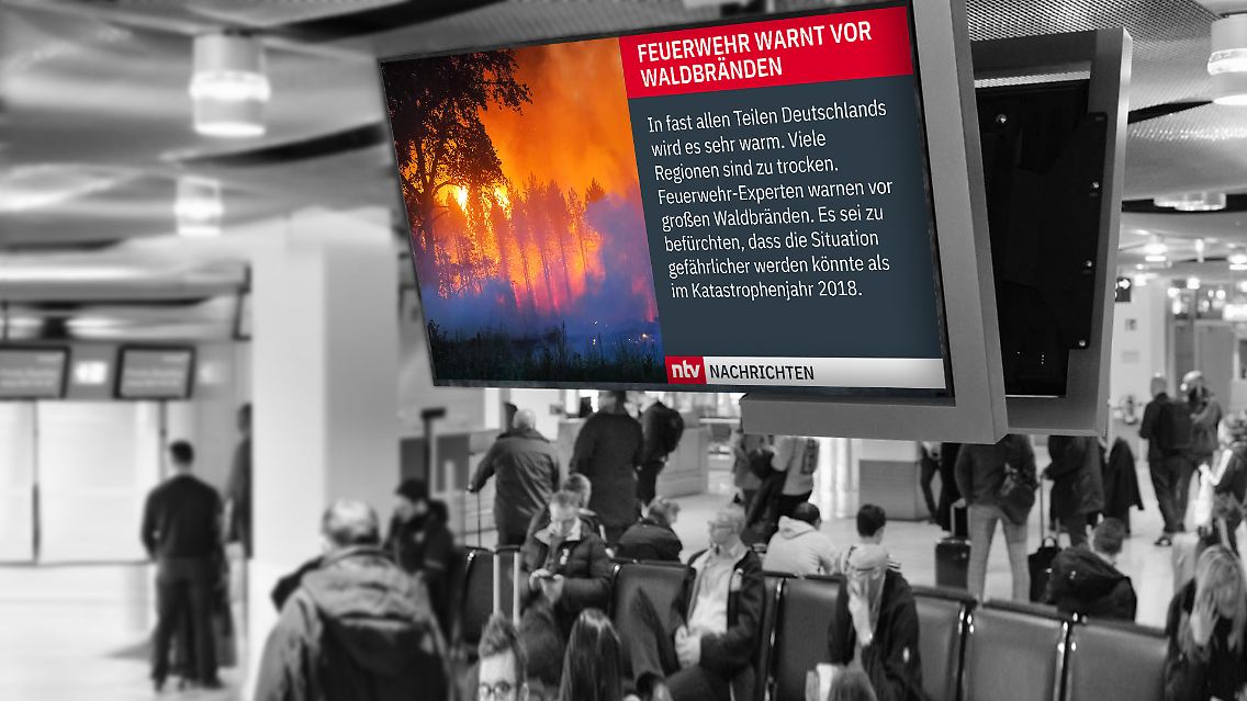 Zehn große deutsche Flughäfen informieren und unterhalten Reisende täglich mit aktuellen Inhalten von ntv.