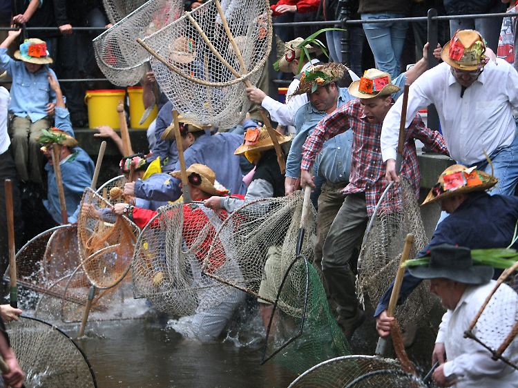 Begleitet von Böllerschüssen und lautem Geschrei sind rund 1200 Männer in den Memminger Stadtbach gesprungen. Die Hobby-Fischer machten mit gabelförmigen Netzen - in Memmingen "Bären" genannt - Jagd auf Forellen. Der "Fischertag" lockt nach Angaben von Michael Ruppert vom Fischertagsverein jedes Jahr mehrere tausend Zuschauer in die Altstadt.