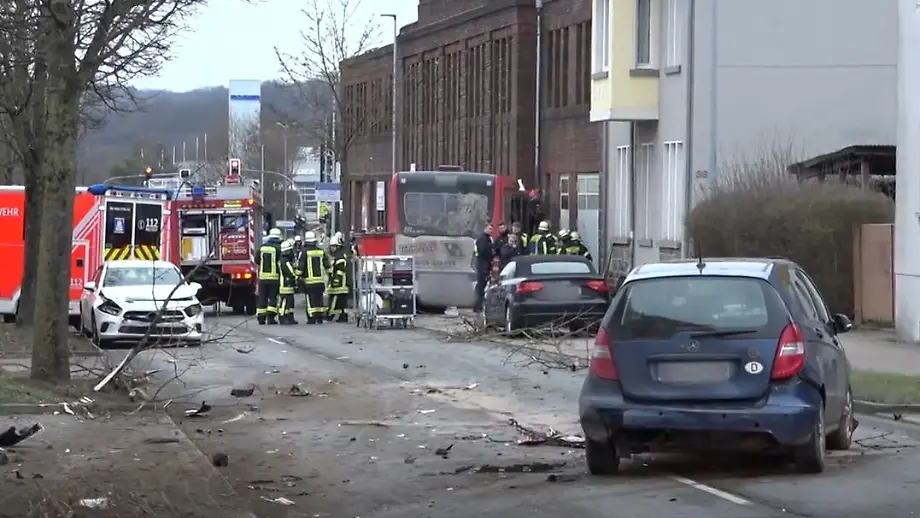 Ein Bus ist in Hemer mit fünf Fahrzeugen kollidiert, hat eines davon in die Front einer Pizzeria gedrückt und ist erst nach rund 200 Metern an einem stillgelegten Gebäude zum Stehen gekommen. Es seien 13 Verletzte zu beklagen, davon schwebe eine Person in Lebensgefahr, berichtete die Polizei im Märkischen Kreis. Zuvor war von zwei lebensgefährlich verletzten Personen die Rede gewesen. "Es ist ein absolutes Trümmerfeld, das sich uns hier zeigt", sagte ein Sprecher der Deutschen Presse-Agentur.