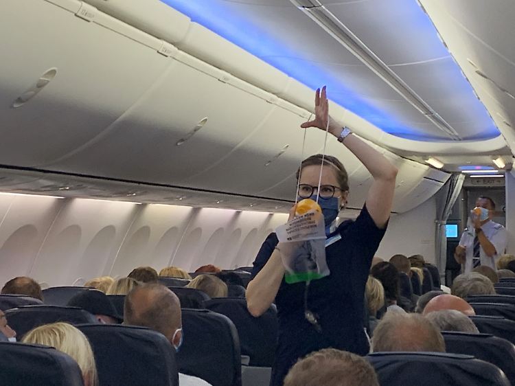 Fast schon wieder normal: Bei Flug X3 2312 werden den Passagieren die Sicherheitsregeln erklärt - mit Maske.
