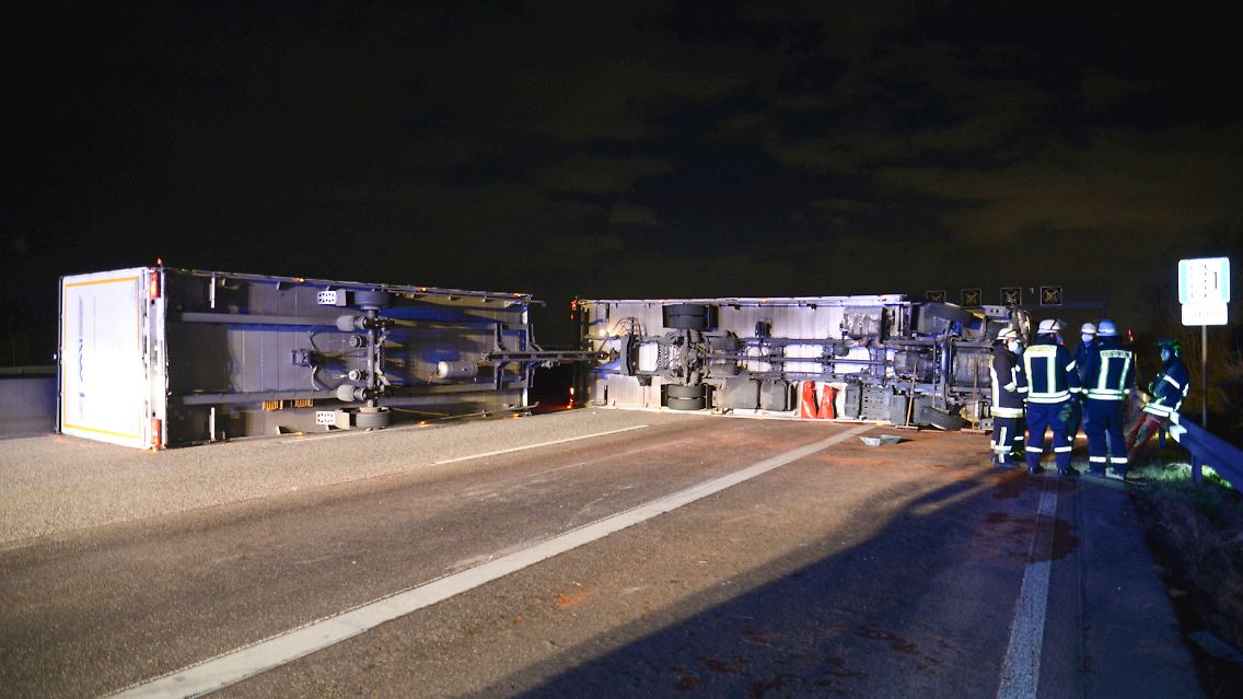 +++ 09:16 Lastwagen auf A5 umgestürzt - Fahrer leicht verletzt +++