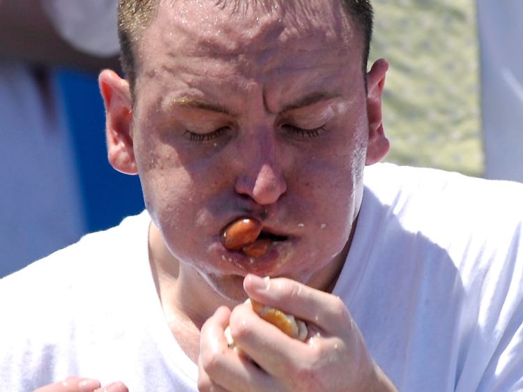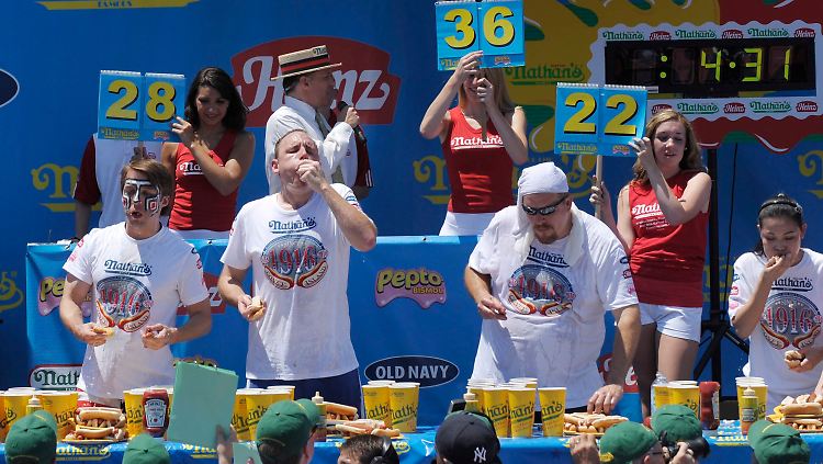 Das jährliche Würstchen-Wettessen in New York hat ein 26-jähriger Kalifornier zum vierten Mal hintereinander gewonnen. Joey Chestnut verschlang in zehn Minuten 54 Hotdogs. Mit 43 Hotdogs blieb der Zweitplatzierte weit hinter dem Sieger zurück. Im Vorjahr hatte Chestnut mit 68 Hotdogs einen Weltrekord aufgestellt. "Ich war langsamer als geplant", räumte der Gewinner am Sonntag ein. Die Sommerhitze habe ihm zugesetzt. Als Sieger erhält der Kalifornier ein Preisgeld in Höhe von 30.000 Dollar und den "Senfgelben Internationalen Gürtel".