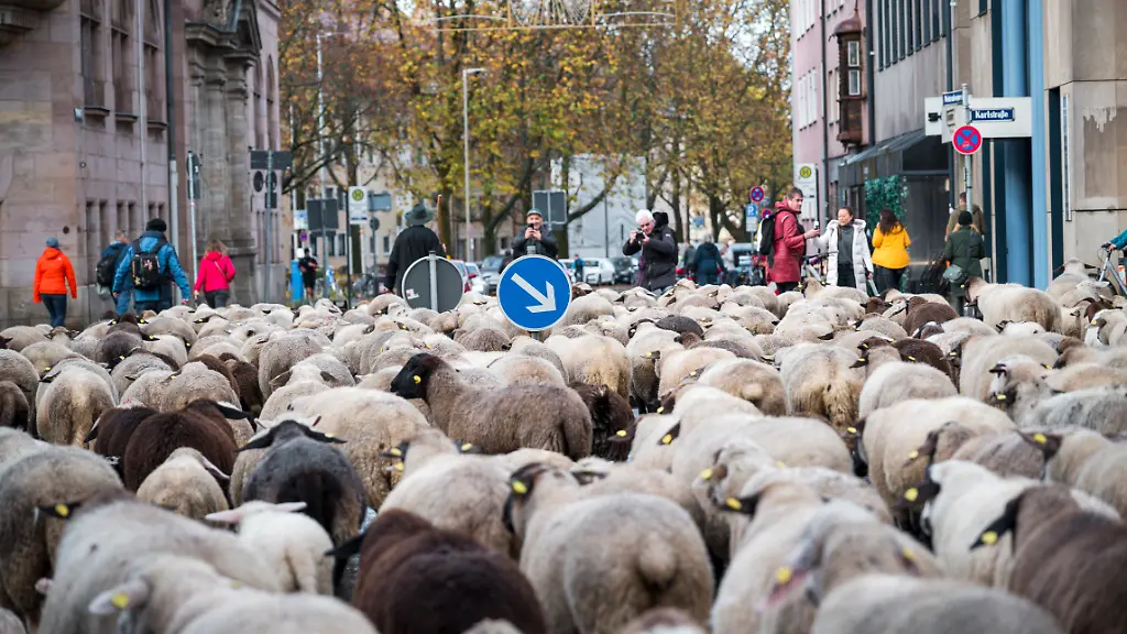 Mit lautem Blöken und von zahlreichen Schaulustigen begleitet treibt ein Schäfer Hunderte Schafe durch die Nürnberger Innenstadt. Das macht er jedes Jahr im November. Für das Schauspiel gibt es jedoch einen Grund.
