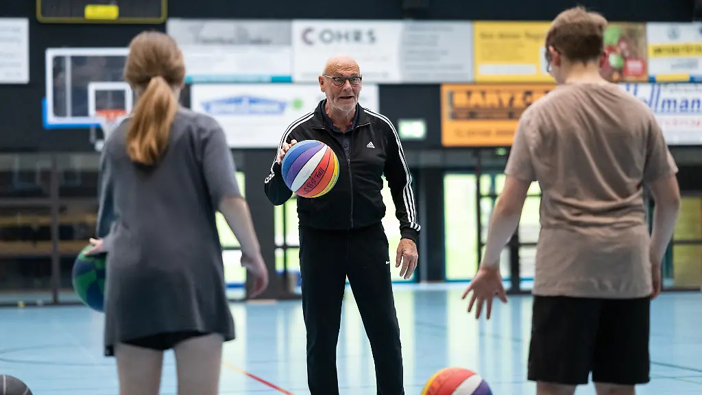 Elegant wirft Manfred Lüssenhop den Basketball auf den Korb in der renovierten Turnhalle, erklärt geduldig die Armführung und das Abklappen des Handgelenks. Technisch ist der 80 Jahre alte Sportlehrer in allen Ballspielen versiert, Tennis und Tischtennis spielte der Walsroder selbst in höheren Ligen. Braungebrannt, mit bunter Brille und im schwarzen Trainingsanzug erkennt ihn jede und jeder in der Lieth-Oberschule in Bad Fallingbostel. "Er ist ein toller Kollege, die Schüler lieben ihn", sagt Schulleiter Andreas Dzionsko, "er hat ein pädagogisches Händchen".