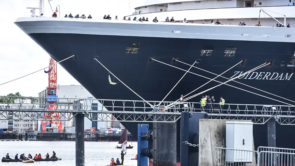 Klimaaktivisten haben im Kieler Hafen ein Kreuzfahrtschiff blockiert und stundenlang an der Abfahrt gehindert. Die Aktivisten näherten sich mit Booten der am Ostseekai festgemachten "Zuiderdam", wie die Polizei mitteilte. Einige der Aktivisten kletterten auf den Bug und die Festmacherleinen des Schiffes. Fünf Aktivisten besetzten darüber hinaus am nahe liegenden Ostseekai einen Kran, zwei von ihnen wollten diesen nicht verlassen und mussten abgeseilt werden.