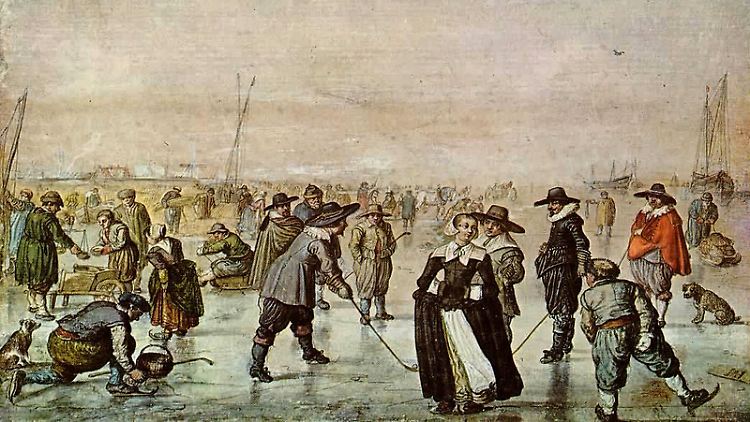 Zu Avercamps Zeit spielte man auf dem Eis gerne Golf, wobei der mit Kuhhaar gefüllte Lederball mit Holzschlägern möglichst weit oder aber möglichst nah an einen bestimmten Punkt geschlagen werden musste. Die umherfliegenden Bälle waren nicht ungefährlich, so dass mancher das Golfspielen auf dem Eis am liebsten verboten hätte. Auf einem Bild von Adriaen van de Velde aus der Gemäldegalerie Dresden sieht man Schlittschuhläufer und Golfspieler auf dem zugefrorenen Stadtgraben von Amsterdam.