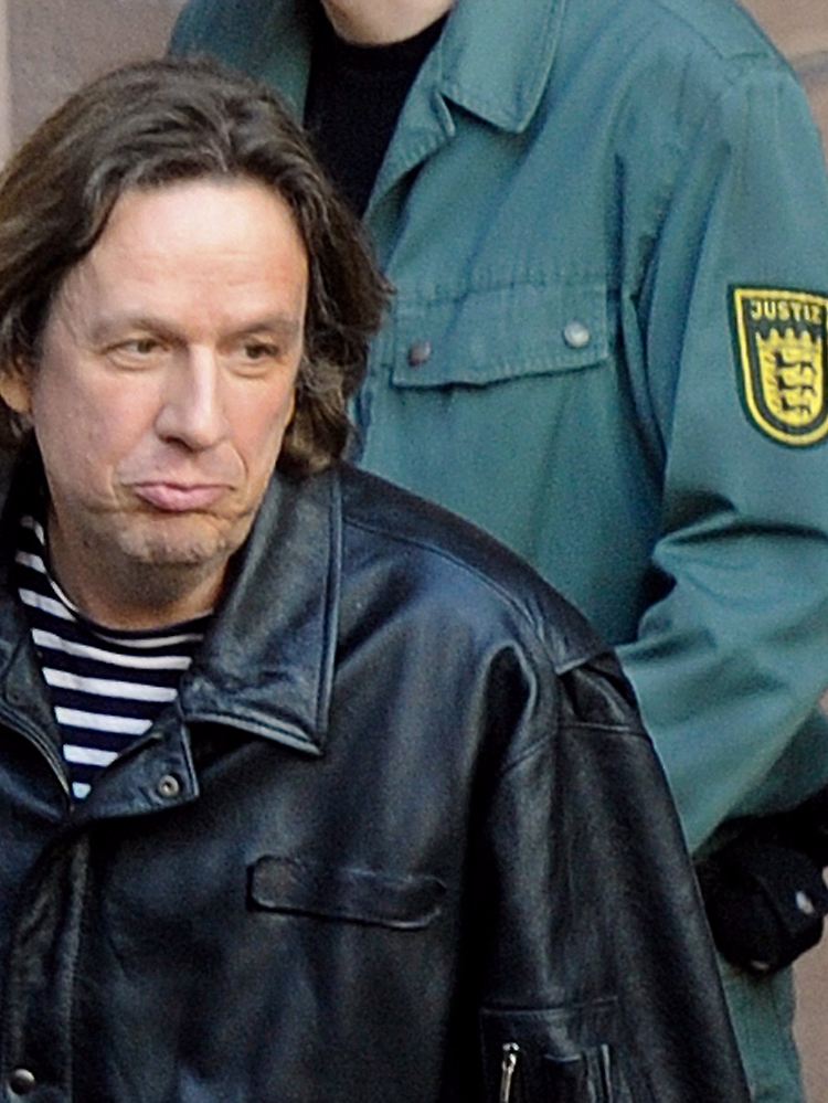 Jörg Kachelmann wird am 24.03.2010 im Amtsgericht Mannheim zu einem Polizeiwagen gebracht.