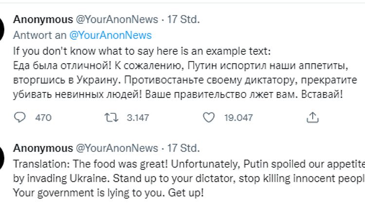 Anonymus empfiehlt, die Beiträge nach "Neueste Beiträge" zu sortieren, sollten die Bewertungen nicht sofort ersichtlich sein, warnt aber auch, dass einige Beiträge Bilder von toten Soldaten oder Zivilisten enthalten können. Ein weiteres Textbeispiel: "Hallo Bürger Russlands! Das ist eine Not-Meldung. Eure Söhne, Brüder, Freunde werden gewaltsam in die Ukraine entsandt, wo sie in das Land unschuldiger Zivilisten einfallen. Das ist keine Rettungsmission. Eure Medien lügen euch an. Unschuldige Menschen sterben. Russische Soldaten werden dazu gezwungen, unschuldige Menschen zu bombardieren und zu erschießen. Bitte verbreitetet diese Nachricht. Wir wissen nicht, wie wir euch sonst erreichen sollen. Protestiert und helft unseren und euren Leuten. Letztendlich sind wir Brüder. Danke."