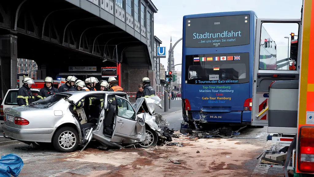 Der Wagen soll am frühen Nachmittag mit hoher Geschwindigkeit auf den Bus aufgefahren sein, der auf dem rechten Fahrstreifen vor dem U-Bahnhof Baumwall stand. Der Fahrer und der Beifahrer des Autos wurden bei der Kollision eingeklemmt, wie ein Feuerwehrsprecher sagte. Alle vier Schwerverletzten mussten den Angaben zufolge aus dem Wrack geschnitten werden.