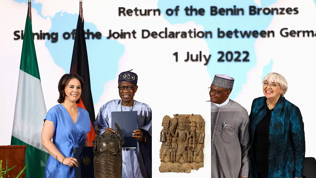 Baerbock, Kulturstaatsministerin Claudia Roth, der nigerianische Kulturminister Lai Mohammed und der Staatsminister für Auswärtige Angelegenheiten, Zubairo Dada, unterzeichneten das vier Seiten und zwölf Unterpunkte umfassende Abkommen, das eine "bedingungslose Rückgabe" vorsieht. Gleichzeitig wollen beide Seiten, "dass die deutschen öffentlichen Museen und Institutionen die Benin-Bronzen weiterhin als Leihgaben ausstellen" können.