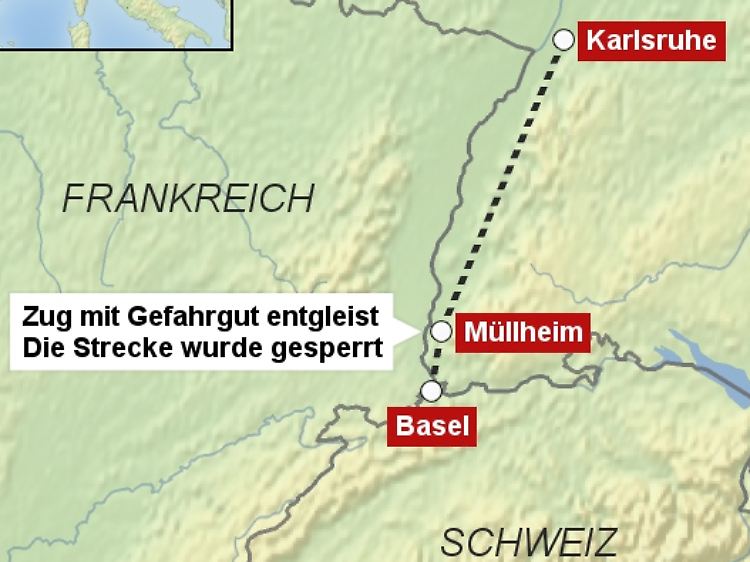 Im Bahnhof von Müllheim war am Freitagmittag ein aus 25 Waggons bestehender Güterzug verunglückt. Acht Waggons hatten sich vom Zug gelöst und waren entgleist. Die Einsatzleitung der Feuerwehr betonte, dass von den ausgelaufenen Stoffen im Bahnhof keine Gefahr ausgehe. Geladen hatte der Zug keine giftigen, aber bei hoher Temperatur entzündliche Chemikalien. Zum Schutz der Bevölkerung hatte die Polizei einen Evakuierungsradius von 500 Metern eingerichtet.
