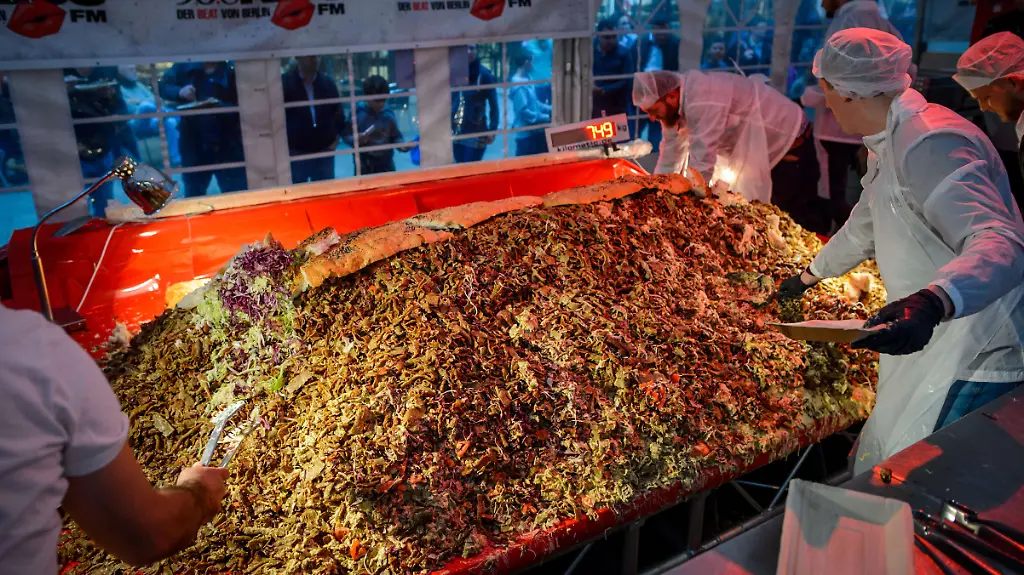 130 Liter Soße, 60 Kilo Rotkohl, 30 Kilo Tomaten: Berlin holt sich die Auszeichnung für den "größten Döner der Welt". Dabei wäre der Rekord-Versuch vor 400 Zuschauern beinahe schief gegangen.