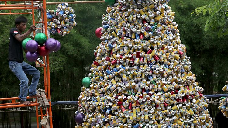 Zu Weihnachten gehört freilich auch in Asien ein Weihnachtsbaum. Es ist sicherlich nicht ausgeschlossen, dass die sich die Oberen 10.000 eine Tanne aus kühleren Regionen bestellen. Doch für die breite Masse gilt es, das Gewächs mit zum Teil außerordentlicher Kreativität nachzustellen. In der indonesischen Hauptstadt Jakarta etwa, haben Tannen-Fans einen Weihnachtsbaum nachgebaut - aus über 10.000 leeren Getränkedosen.