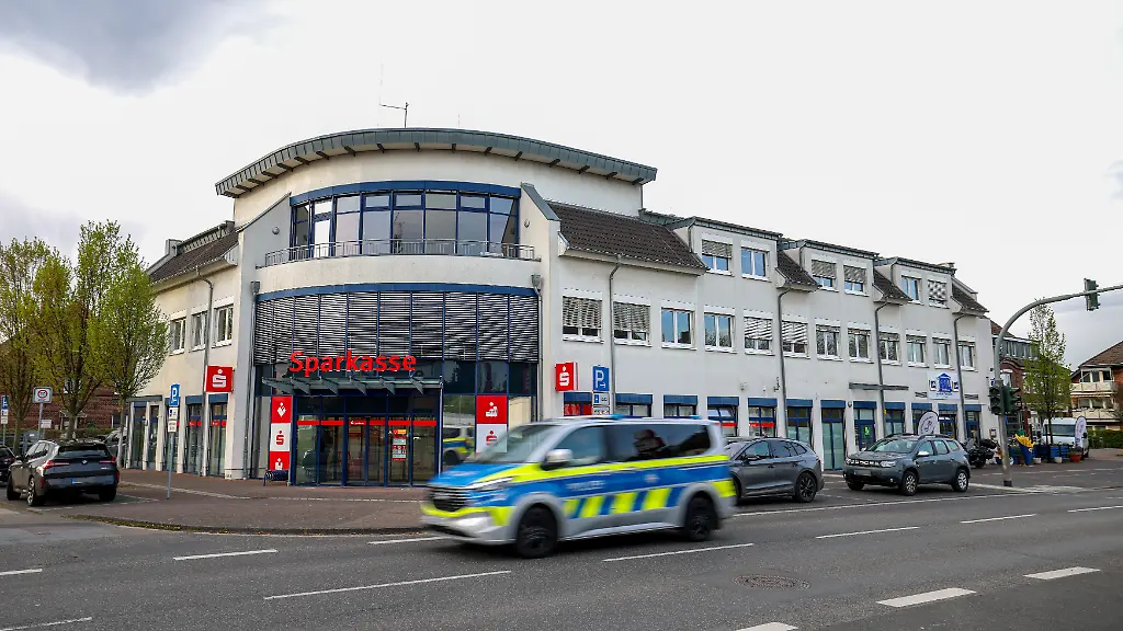 Ein-Polizeiauto-faehrt-an-einer-Sparkassenfiliale-vorbei-Ein-vermutlich-bewaffneter-Mann-hat-mit-dem-Betreten-einer-Sparkassenfiliale-in-Rommerskirchen-bei-Neuss-einen-Grosseinsatz-der-Polizei-ausgeloest-Nach-etwa-zwei-Stunden-habe-der-Mann-sich-widerstandslos-festnehmen-lassen-sagte-eine-Polizeisprecherin