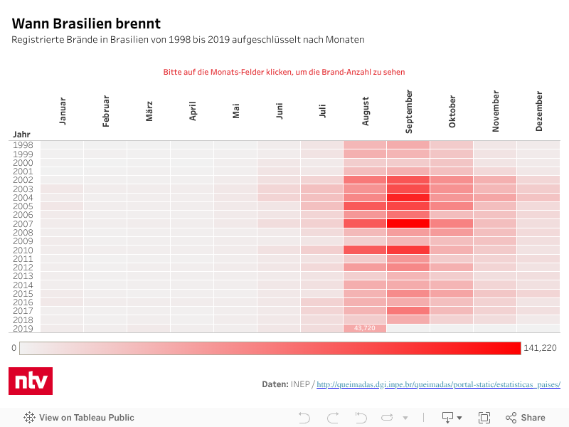Und: Die Trockenzeit, in der die Brände sich auch in bislang intakte Waldflächen ausdehnen können, dauert in der Region noch bis Oktober. Seit 1998 war die Zahl der von INEP registrierten Brände in Brasilien im September fast immer höher als im August. Die einzige Ausnahme war das Jahr 1999.