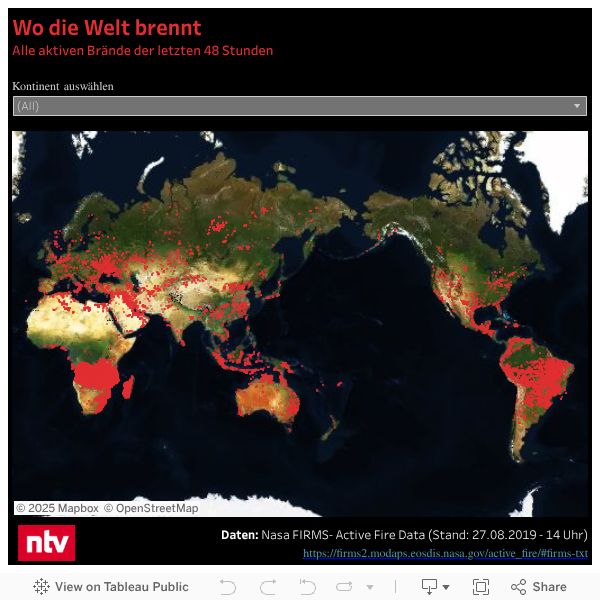Anmerkung: In einer früheren Fassung dieses Beitrags fehlte die Erklärung, dass die Daten des Nasa-Projekts lediglich eine Übersicht zur Anzahl und der Lage aller aktuell registrierten Brände darstellen und keine Rückschlüsse zum Ausmaß des jeweiligen Feuers ermöglichen. Wir haben diese Angaben ergänzt und den Titel gekürzt.