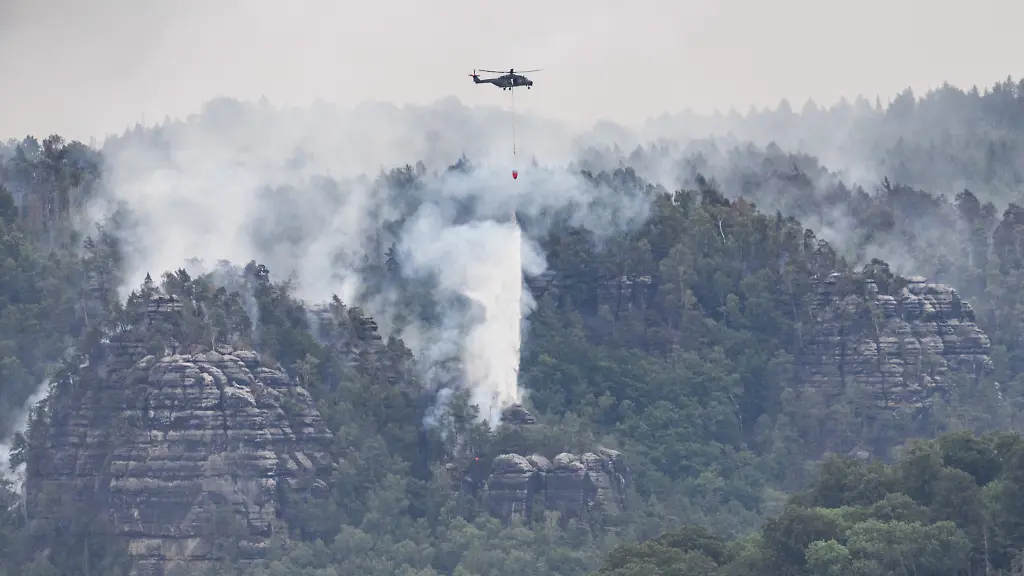 Beim Brandgeschehen in der Sächsischen Schweiz waren laut Landkreis am Mittwoch tagsüber durchschnittlich etwa 400 Einsatzkräfte vor Ort, verstärkt durch zwei Hubschrauber der Bundespolizei und drei der Bundeswehr. "Die Löschflüge sind sehr effektiv, und der Einsatz hat sich bewährt. Da die Brandlage noch immer angespannt ist, streben wir an, den Einsatz der Hubschrauber auch am Wochenende fortzusetzen", so Landrat Michael Geisler. Bisher seien zwei Feuerwehrleute leicht verletzt worden.