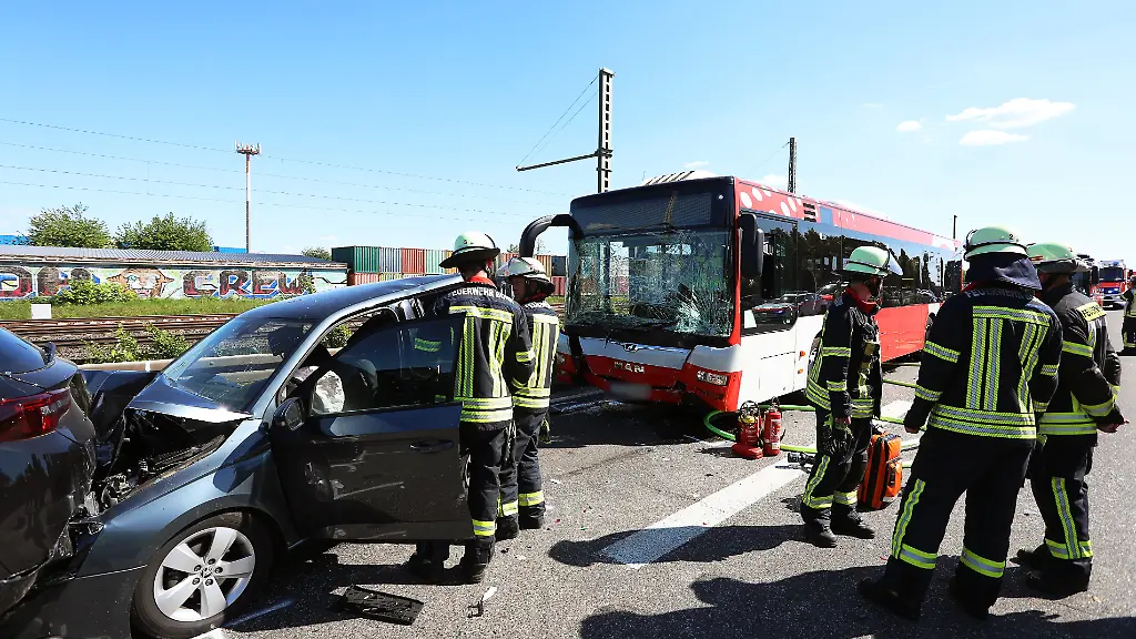 Das Auto, in das der Bus gekracht war, wurde durch die Wucht des Aufpralls so schwer demoliert, dass dort eine Beifahrerin eingeklemmt wurde, sagte ein Polizeisprecher. Die 63-Jährige sei mit schweren Verletzungen mit einem Rettungshubschrauber in eine Klinik geflogen worden. Sieben weitere Menschen wurden ebenfalls verletzt in Krankenhäuser gebracht.