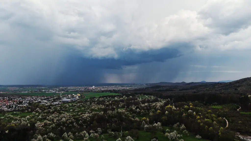 Dunkle Gewitterwolken ziehen hinter Mössingen am Fuß der mittleren Schwäbischen Alb auf: Besonders in Süddeutschland bilden sich zu Wochenbeginn örtlich Gewitter. (Foto: picture alliance / onw-images)