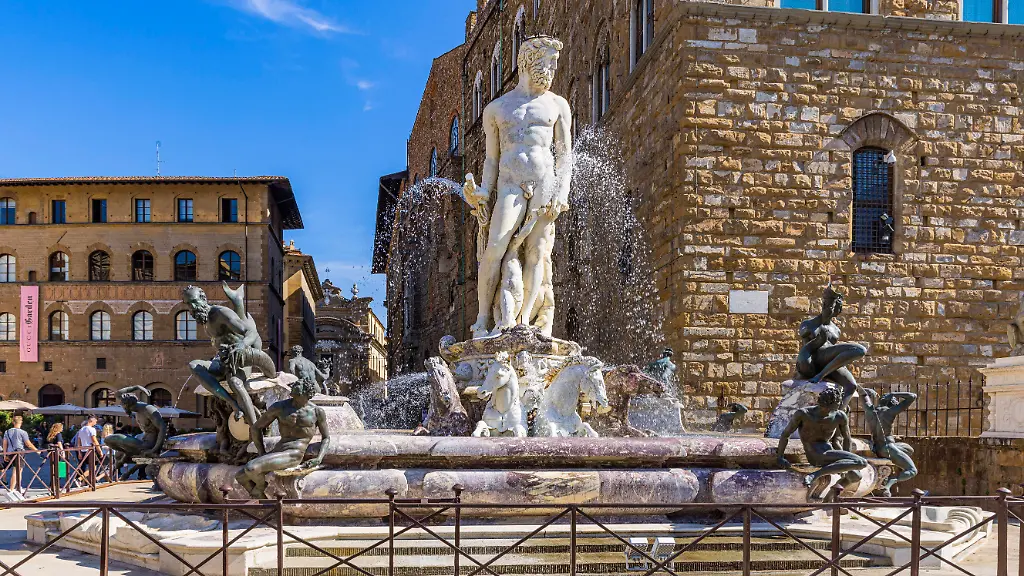 Der im 16. Jahrhundert errichtete Neptunbrunnen ist eines der Wahrzeichen von Florenz. In der vergangenen Nacht klettert ein deutscher Urlauber auf dem Bauwerk herum und beschädigt es. Überwachungskameras filmen die Tat.