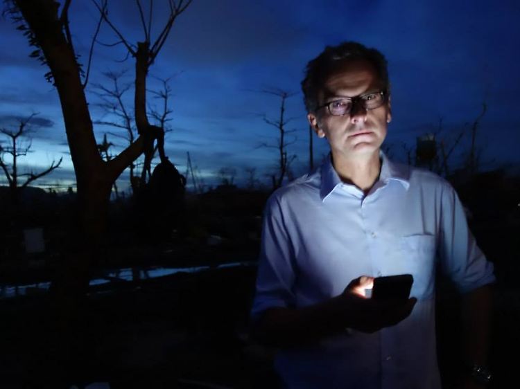 Um 17 Uhr geht der Tag zu Ende. Tacloban verwandelt sich binnen 30 Minuten in eine komplett dunkle Stadt. Kein Strom bedeutet auch kein Licht. Nur in der Nähe des Rathauses gibt es einen funktionierenden Generator, den sich Hilfsorganisationen mit Journalisten teilen. Der reicht für ein bisschen Licht und dafür, Akkus für Telefone, Notebooks, Kameras und Satelliten-Anlagen aufzuladen. Zwischen den Kisten bauen wir uns aus Rucksäcken, Pappkartons und Planen ein Nachtlager. Der Himmel ist klar an diesem Abend, so dass der Vollmond über die Stadt scheint.