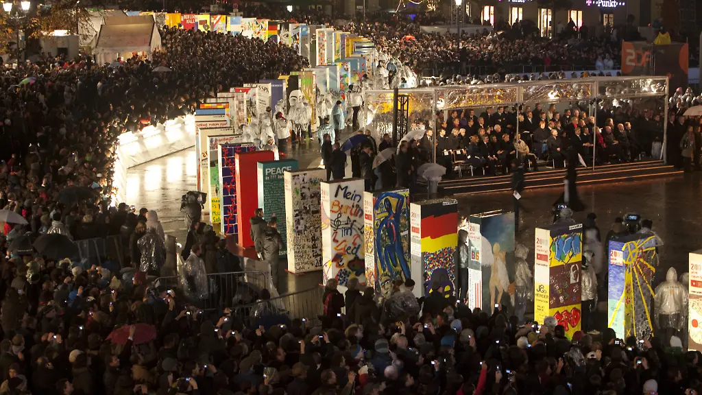 Berlin feiert die FreiheitDie Steine waren von Schülern, Azubis, Künstlern und Prominenten gestaltet worden. Gerade Jüngere, die den Mauerfall nicht selbst erlebten, hatten sich auf diese Weise mit dem historischen Ereignis auseinandergesetzt. Ein Teil der übermannsgroßen Kunststoff-Elemente hatte auch in anderen Ländern ein Gesicht bekommen. So hatte etwa Friedensnobelpreisträger Nelson Mandela aus Südafrika mit seiner Familie einen Stein geprägt.