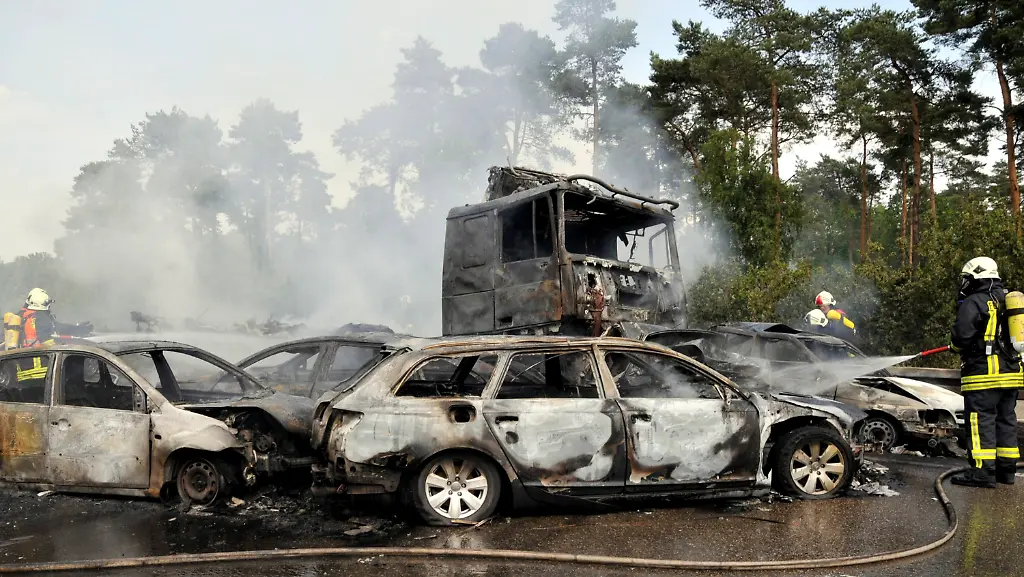 Offensichtlich sei der Laster mit voller Wucht auf dieses Auto aufgefahren: "Es sieht so aus, dass der Lkw seine gesamte Energie in dieses Fahrzeug abgelassen hat. Es spricht einiges dafür", sagte Probst. Sieben weitere Autos brannten komplett aus. Fahrer und Beifahrer flüchteten rechtzeitig aus diesen Fahrzeugen. Welches Auto zuerst in Brand geriet, konnte noch niemand sagen.