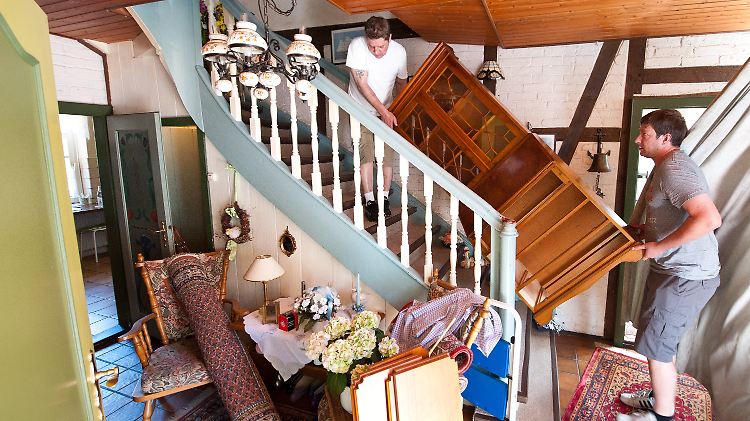 Helfer tragen in Hitzacker Möbel in ein höheres Stockwerk, damit diese nicht nass werden.